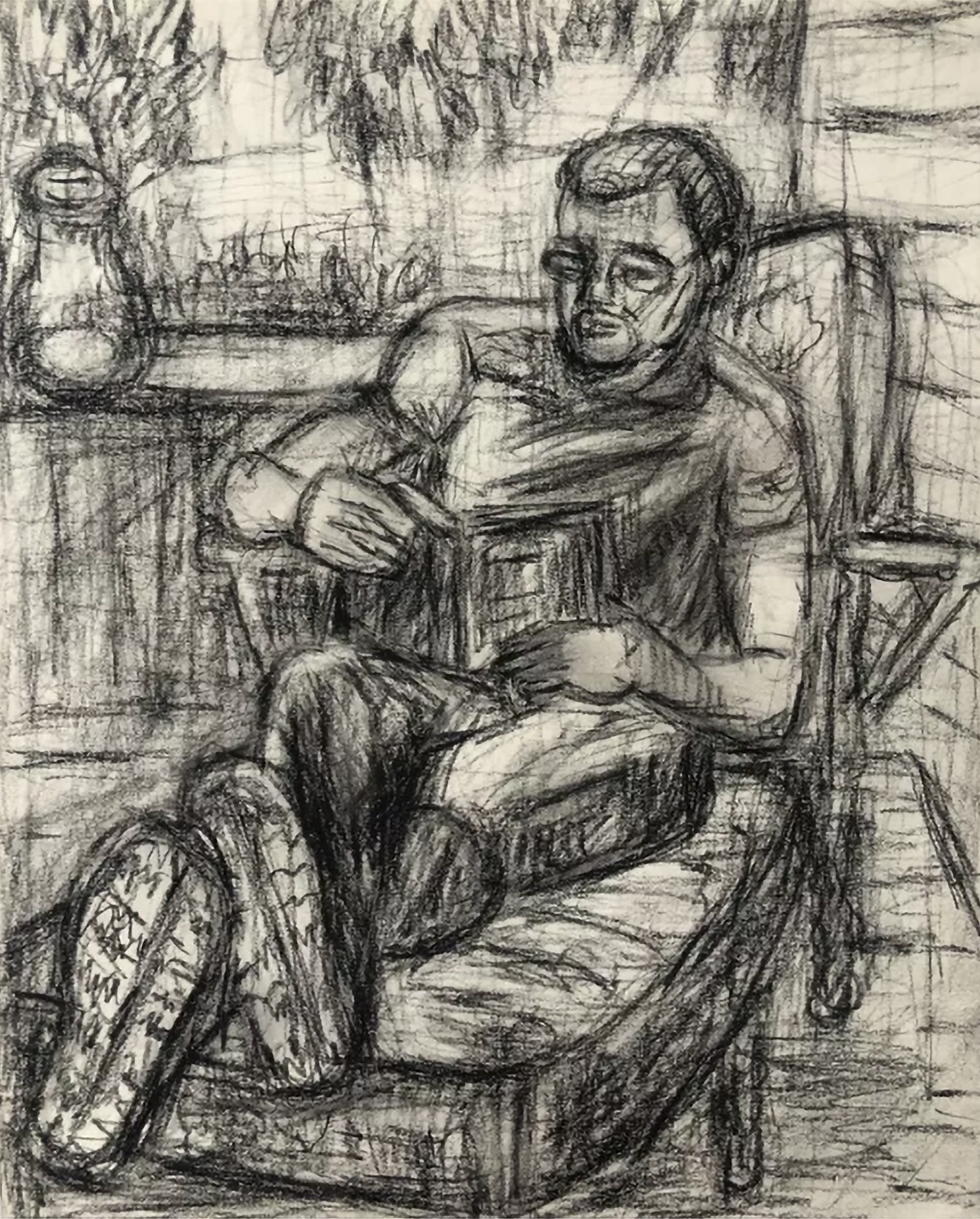During this time, I had the opportunity to be in upstate New York, and I used my studio days to read and draw. Following in the age-old tradition of painting from nature, I drew outside. When it was too cold, I drew the interiors of the house and studio, including a few people and two cats. With form and color, I attempted to reflect the mood of both quarantine and racial reckoning.